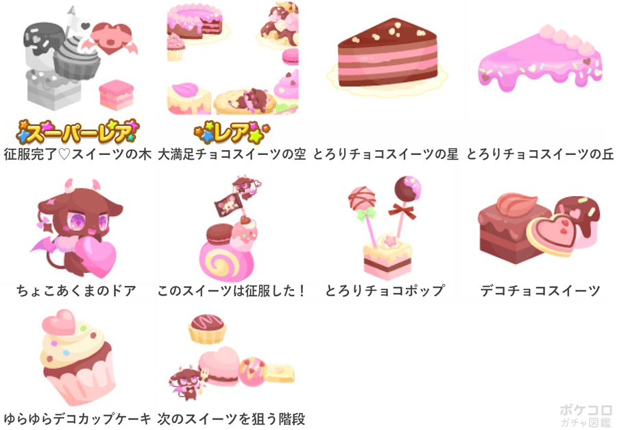 ★征服完了♡スイーツの木 No.1714 征服完了♡チョコカレー 征服完了ちょこあくまの実 ☆大満足チョコスイーツの空 とろりチョコスイーツの星 とろりチョコスイーツの丘 ちょこあくまのドア このスイーツは征服した! とろりチョコポップ デコチョコスイーツ ゆらゆらデコカップケーキ 次のスイーツを狙う階段