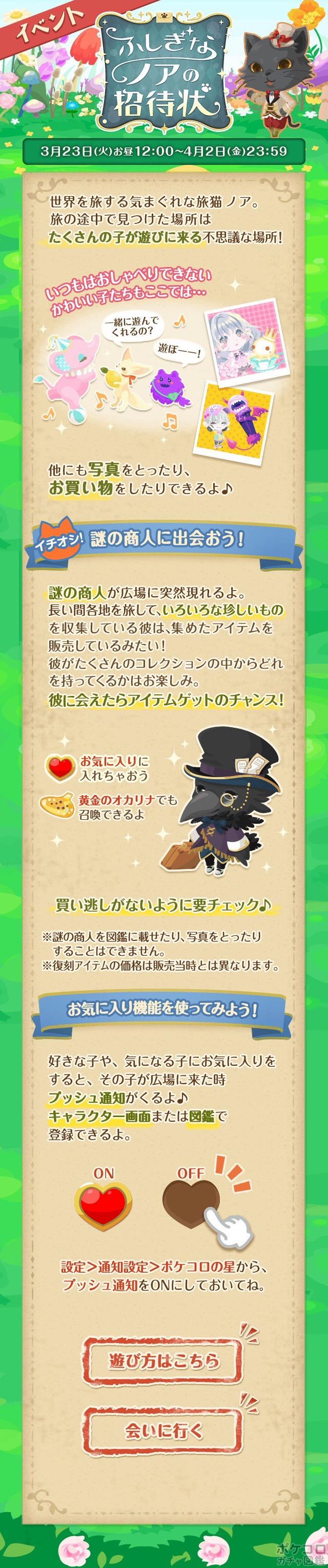 【イベントで復刻】 ・ 2023.11.02〜2023.11.12『第9回ふしぎなノアの招待状』 (復刻アイテム一覧→『復刻』) ・2024.05.27〜2024.05.31『ふしぎなノアの招待状mini』 (とまぴよ・シトロン のみ復刻) ・2024.10.03〜2024.10.13『第10回ふしぎなノアの招待状』 (ネズミ機動隊 のみ復刻)