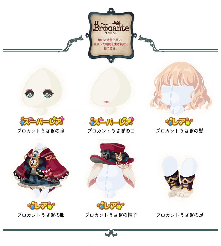 ★ブロカントうさぎの瞳(顔パーツ)(4000) ★ブロカントうさぎの口(顔パーツ)(3800) ☆ブロカントうさぎの髪(2800) ☆ブロカントうさぎの服(2000) ☆ブロカントうさぎの帽子(1700) ブロカントうさぎの足(800)