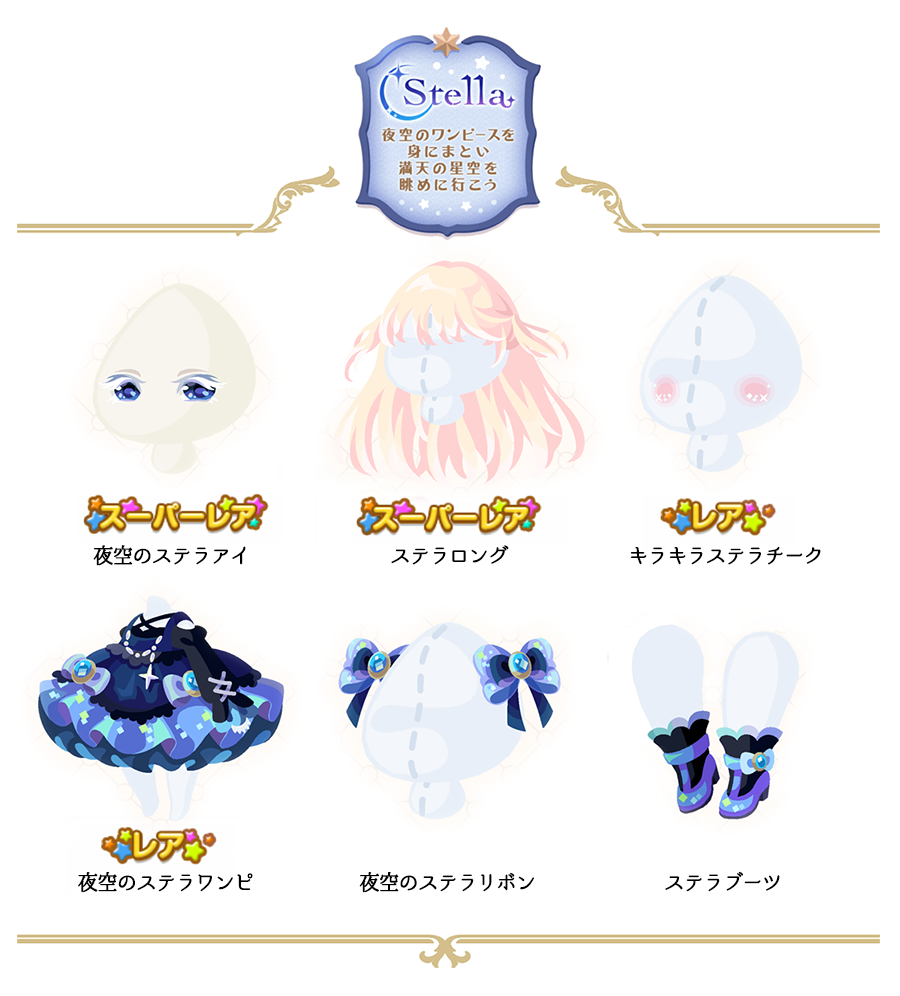 ★夜空のステラアイ(顔パーツ)(4000) ★ステラロング(4000) ☆キラキラステラチーク(2800) ☆夜空のステラワンピ(2500) 夜空のステラリボン(1800) ステラブーツ(800)