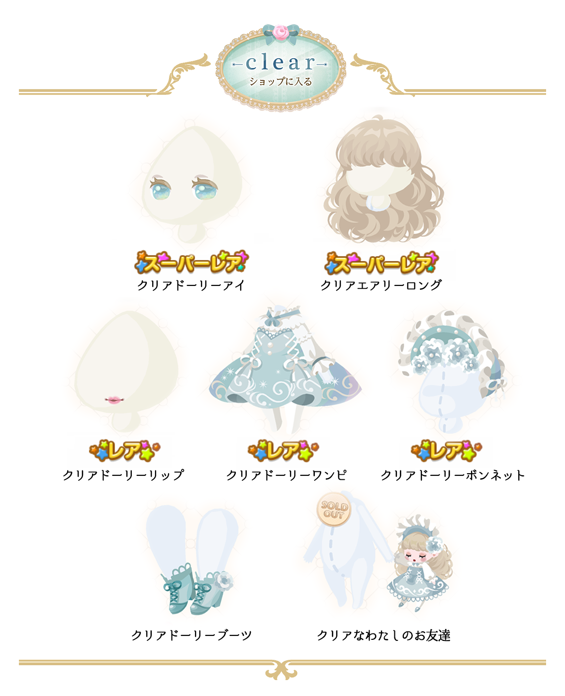 ★クリアドーリーアイ(顔パーツ)(3500) ★クリアエアリーロング(3200) ☆クリアドーリーリップ(顔パーツ)(2800) ☆クリアドーリーワンピ(1800) ☆クリアドーリーボンネット(2500) クリアドーリーブーツ(600) クリアなわたしのお友達(800)