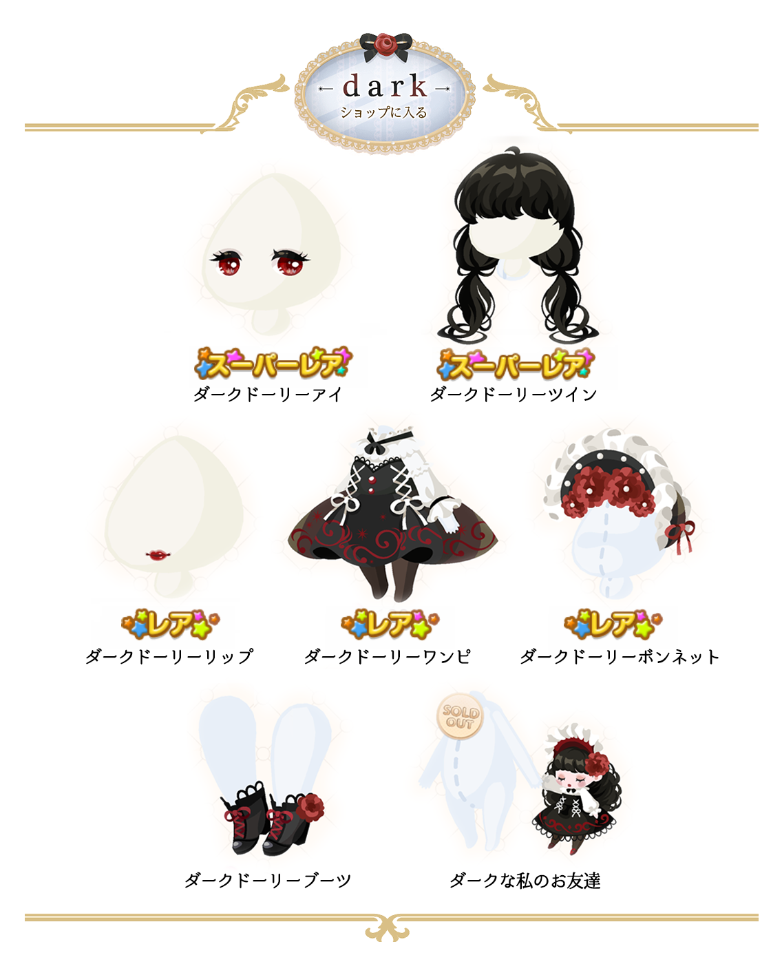 ★ダークドーリーアイ(顔パーツ)(3500) ★ダークドーリーツイン(3500) ☆ダークドーリーリップ(顔パーツ)(2800) ☆ダークドーリーワンピ(1800) ☆ダークドーリーボンネット(2500) ダークドーリーブーツ(600) ダークな私のお友達(800)