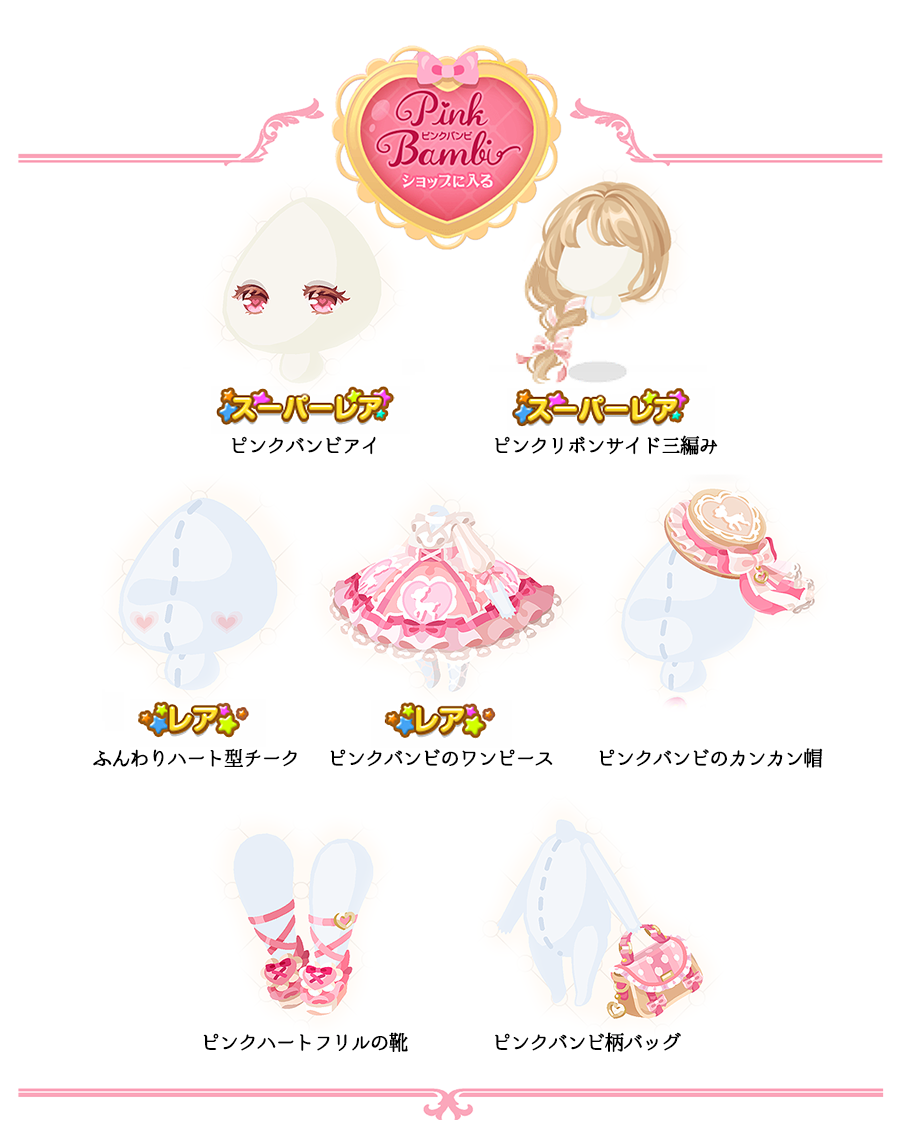 ★ピンクバンビアイ(顔パーツ)(4200) ★ピンクリボンサイド三編み(3300) ☆ふんわりハート型チーク(3000) ☆ピンクバンビのワンピース(2000) ピンクバンビのカンカン帽(1500) ピンクハートフリルの靴(800) ピンクバンビ柄バッグ(600)