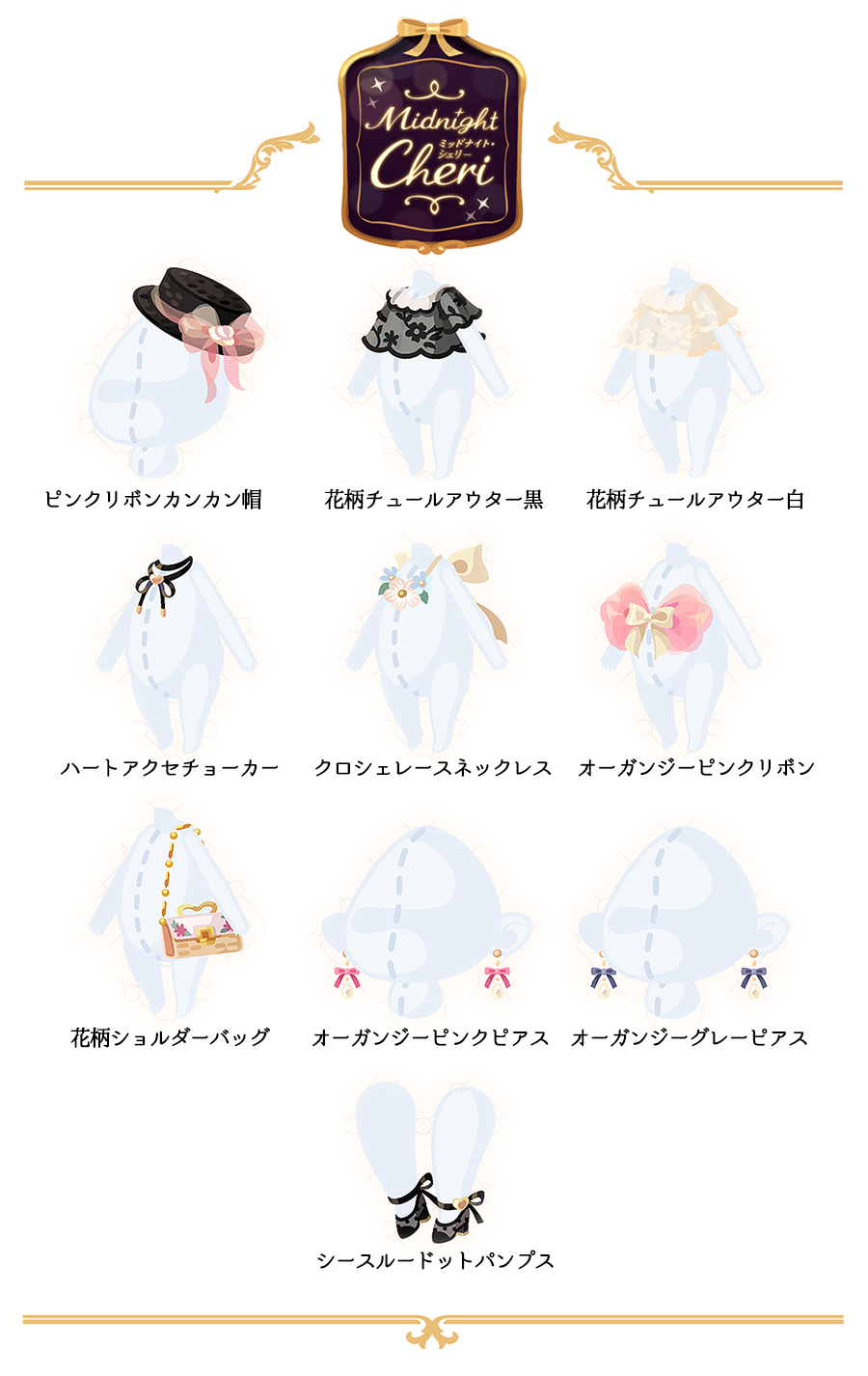 ピンクリボンカンカン帽(800) 花柄チュールアウター黒(680) 花柄チュールアウター白(680) ハートアクセチョーカー(650) クロシェレースネックレス(650) オーガンジーピンクリボン(650) 花柄ショルダーバッグ(650) オーガンジーピンクピアス(450) オーガンジーグレーピアス(450) シースルードットパンプス(350)