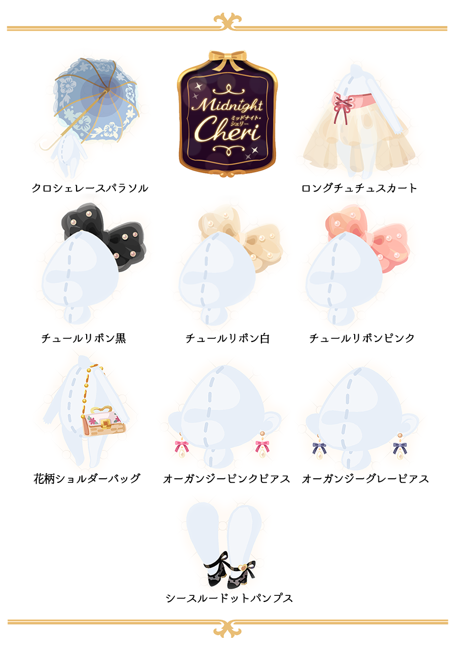 クロシェレースパラソル(950) ロングチュチュスカート(800) チュールリボン黒(800) チュールリボン白(800) チュールリボンピンク(800) 花柄ショルダーバッグ(650) オーガンジーピンクピアス(450) オーガンジーグレーピアス(450) シースルードットパンプス(350)