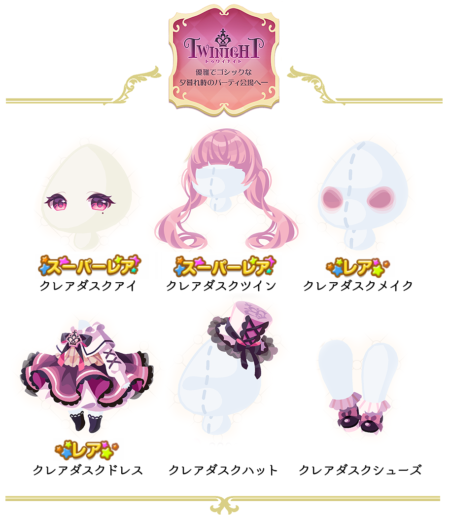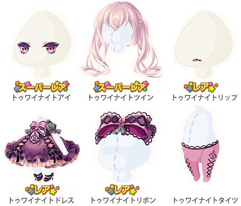 ★トゥワイナイトアイ(顔パーツ)(4000) ★トゥワイナイトツイン(4000) ☆トゥワイナイトリップ(顔パーツ)(2500) ☆トゥワイナイトドレス(2500) ☆トゥワイナイトリボン(2000) トゥワイナイトタイツ(800)