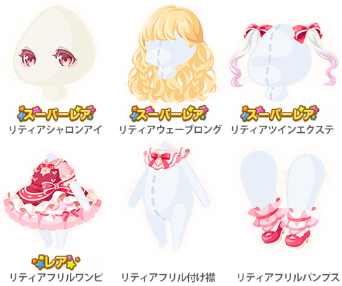 ★リティアシャロンアイ(顔パーツ)(4000) ★リティアウェーブロング(4000) ★リティアツインエクステ(3500) ☆リティアフリルワンピ(2500) リティアフリル付け襟(1200) リティアフリルパンプス(800)