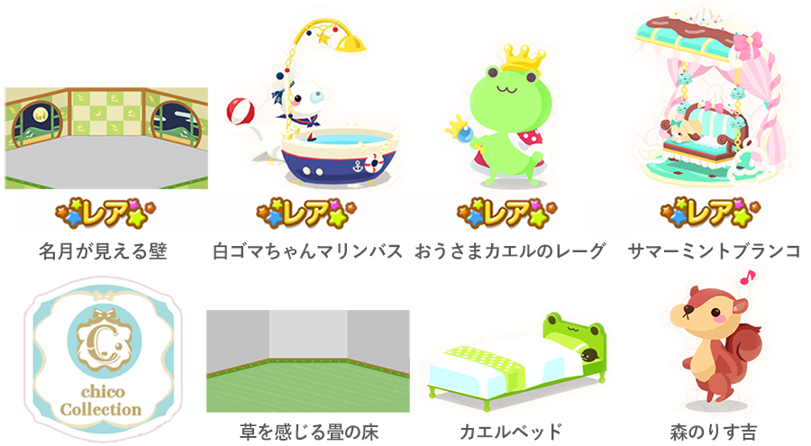 ☆名月が見える壁(8000) ☆白ゴマちゃんマリンバス(4780) ☆おうさまカエルのレーグ(2930) ☆サマーミントブランコ(1500) 草を感じる畳の床(1600) カエルベッド(3740) 森のりす吉(2480)