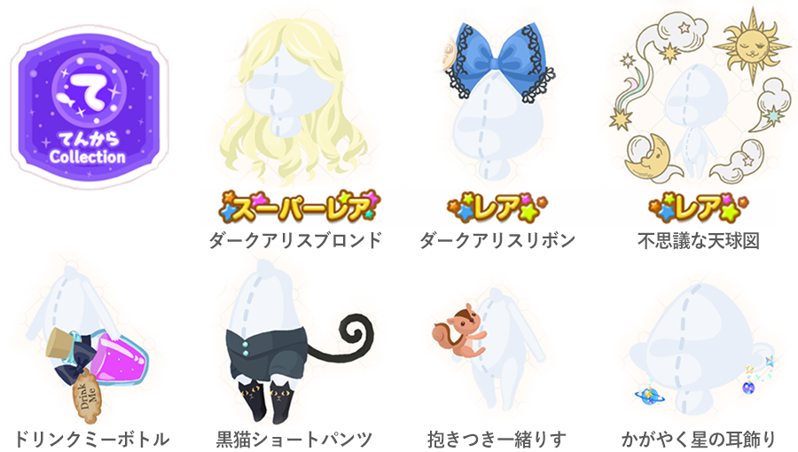 過去のガチャからピックアップ ・2014年5月 ダークアリス ・2014年1月 天球儀ロマネスク ・2014年4月 黒猫クラシカル ・2012年11月 おとぎの森の隠れ家 ・2014年6月 七夕ミルキーウェイ