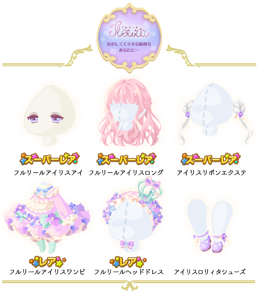 ★フルリールアイリスアイ(顔パーツ)(4000) ★フルリールアイリスロング(4000) ★アイリスリボンエクステ(3300) ☆フルリールアイリスワンピ(2500) ☆フルリールヘッドドレス(2000) アイリスロリィタシューズ(800)