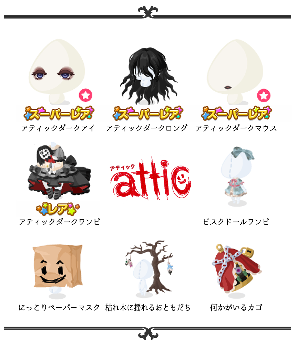 ★アティックダークアイ(顔パーツ) (3000) ★アティックダークロング(1900) ★アティックダークマウス(顔パーツ) (1400) ☆アティックダークワンピ(1600) ビスクドールワンピ(900) にっこりペーパーマスク(900) 枯れ木に揺れるおともだち(500) 何かがいるカゴ(340)