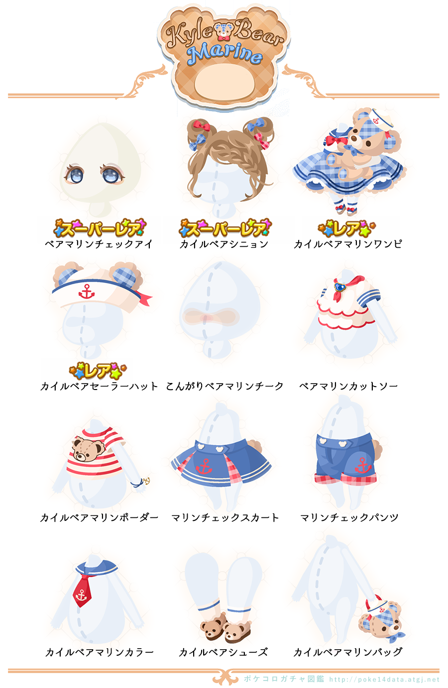 ★ベアマリンチェックアイ(顔パーツ)(3800) ★カイルベアシニョン(3500) ☆カイルベアマリンワンピ(2500) ☆カイルベアセーラーハット(1600) こんがりベアマリンチーク(800) ベアマリンカットソー(850) カイルベアマリンボーダー(600) マリンチェックスカート(700) マリンチェックパンツ(650) カイルベアマリンカラー(650) カイルベアシューズ(700) カイルベアマリンバッグ(650)