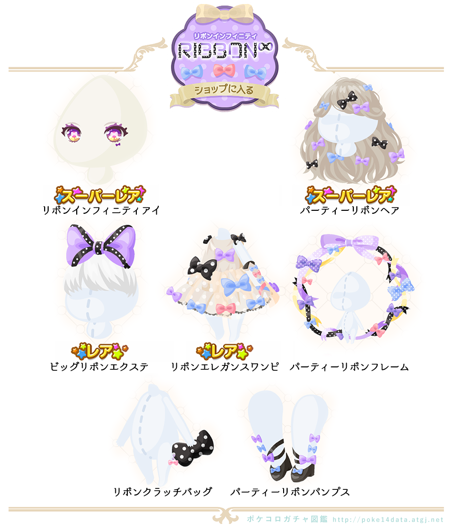 ★リボンインフィニティアイ(3400)(顔パーツ) ★パーティーリボンヘア(3300) ☆ビッグリボンエクステ(1600) ☆リボンエレガンスワンピ(1300) パーティーリボンフレーム(1000) リボンクラッチバッグ(500) パーティーリボンパンプス(600)