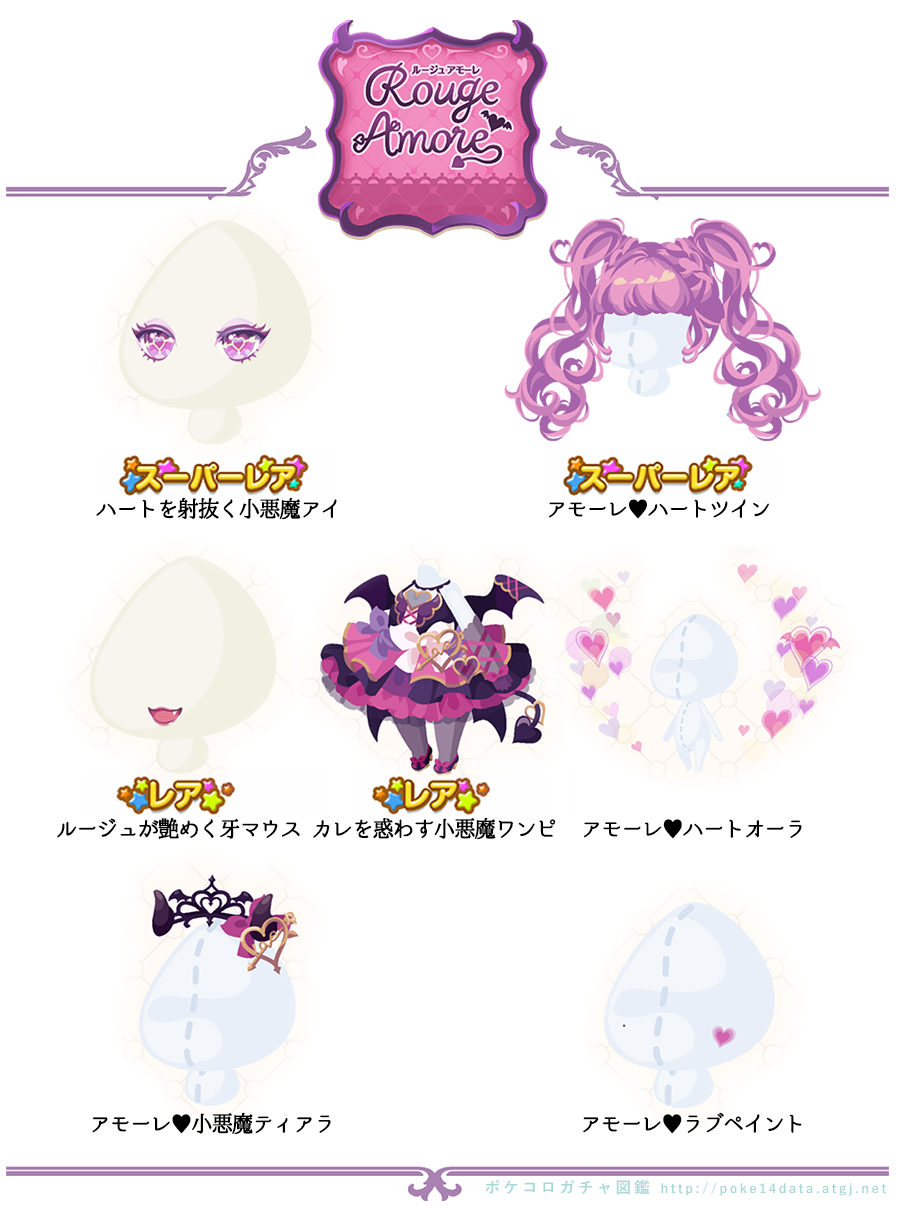 ★ハートを射抜く小悪魔アイ(顔パーツ)(3200) ★アモーレ❤︎ハートツイン(3400) ☆ルージュが艶めく牙マウス(顔パーツ)(1800) ☆カレを惑わす小悪魔ワンピ(2200) アモーレ❤︎ハートオーラ(1000) アモーレ❤︎小悪魔ティアラ(700) アモーレ❤︎ラブペイント(700)