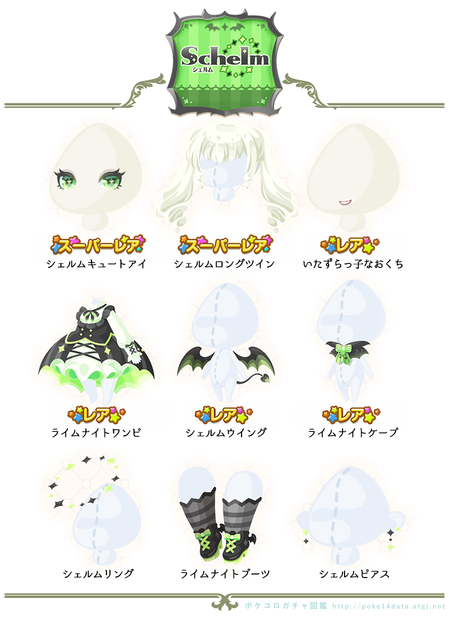 ★シェルムキュートアイ(顔パーツ)(3200) ★シェルムロングツイン(3700) ☆いたずらっ子なおくち(顔パーツ)(1600) ☆ライムナイトワンピ(1800) ☆シェルムウイング(2000) ☆ライムナイトケープ(1200) シェルムリング(650) ライムナイトブーツ(700) シェルムピアス(650)