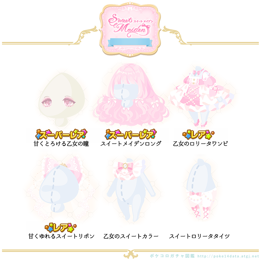 ★甘くとろける乙女の瞳(顔パーツ)(4200) ★スイートメイデンロング(3300) ☆乙女のロリータワンピ(2300) ☆甘くゆれるスイートリボン(1800) 乙女のスイートカラー(1100) スイートロリータタイツ(900)