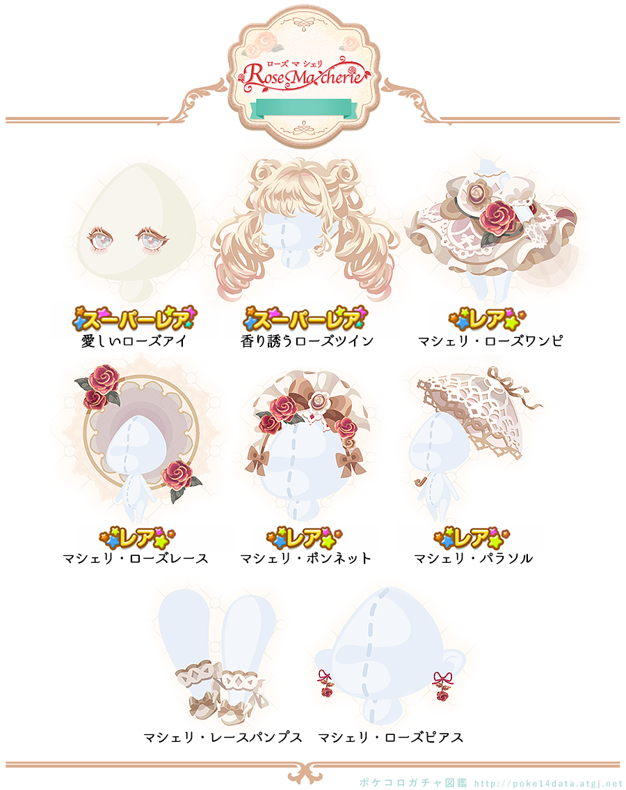★愛しいローズアイ(顔パーツ)(4200) ★香り誘うローズツイン(3300) ☆マシェリ・ローズワンピ(2300) ☆マシェリ・ローズレース(1500) ☆マシェリ・ボンネット(1500) ☆マシェリ・パラソル(1200) マシェリ・レースパンプス(800) マシェリ・ローズピアス(700)