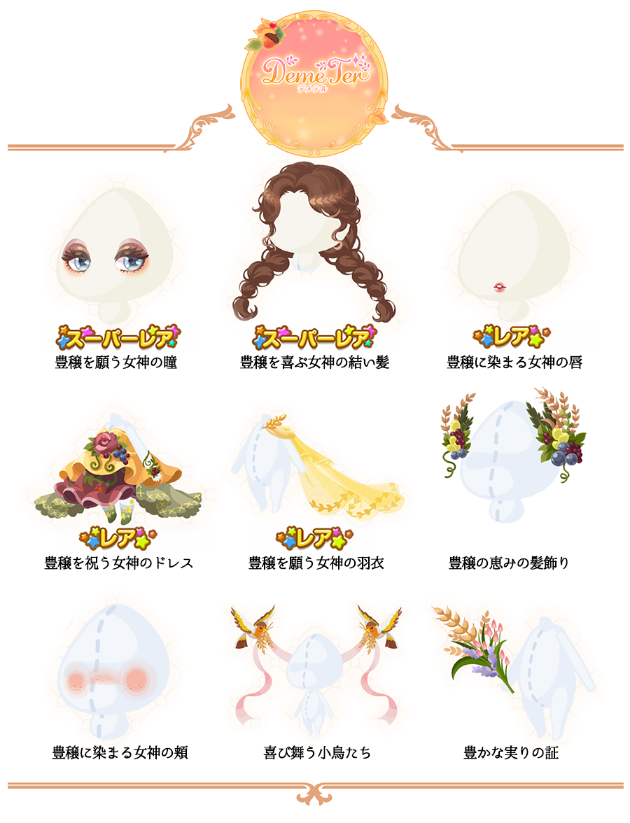 ★豊穣を願う女神の瞳(顔パーツ)(3400) ★豊穣を喜ぶ女神の結い髪(3500) ☆豊穣に染まる女神の唇(顔パーツ)(2200) ☆豊穣を祝う女神のドレス(1000) ☆豊穣を願う女神の羽衣(1200) 豊穣の恵みの髪飾り(700) 豊穣に染まる女神の頬(800) 喜び舞う小鳥たち(800) 豊かな実りの証(500)