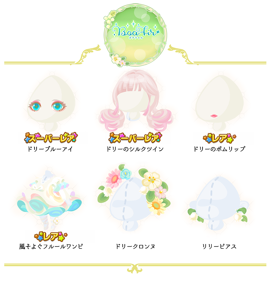 ☆涼やかクーリッシュアイ(顔パーツ)(1500) ☆春色フェアリーボブ(950) ☆スイートキャンディチーク(1800) ☆スイートレースフラワー(1200) キュートウェディングミニ(1280) リボンハートバルーン(750) クラシカルフリルカフス(300)