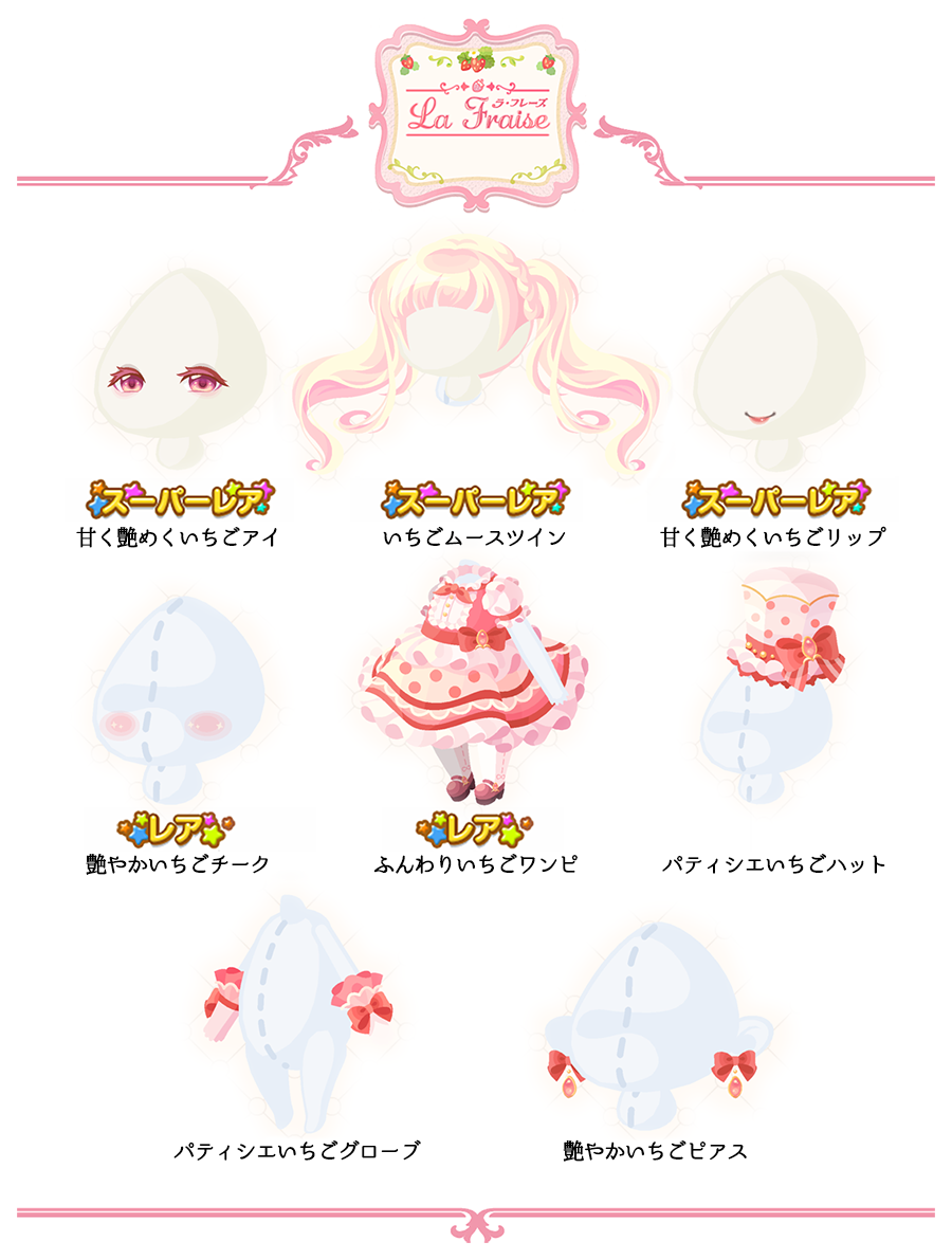 ★甘く艶めくいちごアイ(顔パーツ)(4000) ★いちごムースツイン(4000) ★甘く艶めくいちごリップ(顔パーツ)(3200) ☆艶やかいちごチーク(2400) ☆ふんわりいちごワンピ(1800) パティシエいちごハット(800) パティシエいちごグローブ(800) 艶やかいちごピアス(800)