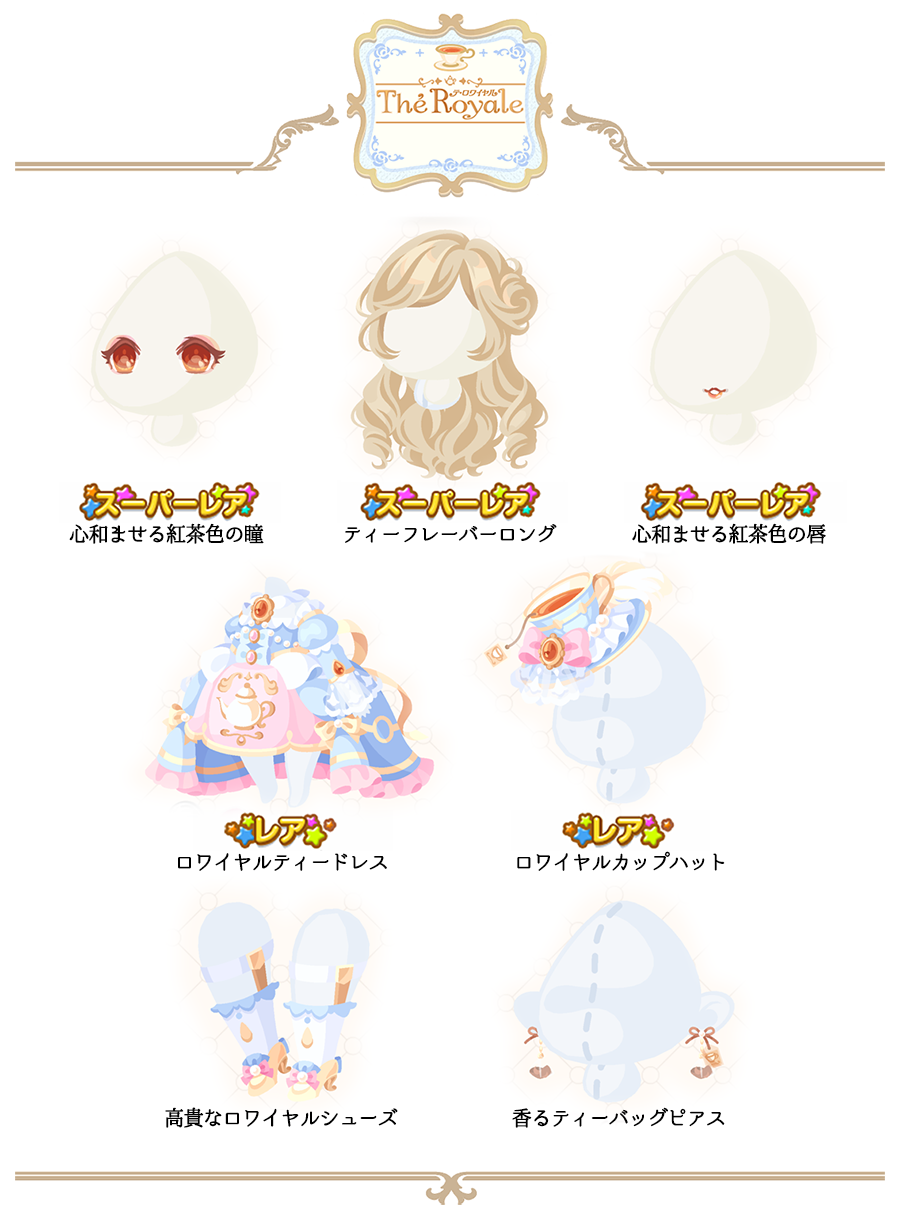 ★心和ませる紅茶色の瞳(顔パーツ)(3800) ★ティーフレーバーロング(3800) ★心和ませる紅茶色の唇(顔パーツ)(3200) ☆ロワイヤルティードレス(1700) ☆ロワイヤルカップハット(1100) 高貴なロワイヤルシューズ(800) 香るティーバッグピアス(650)