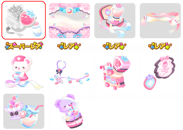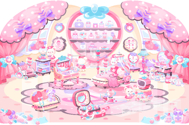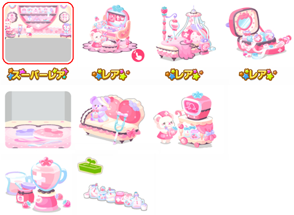 ★いちごミルク病室の壁 ☆おかげんいかがですか?(アクションアイテム) ☆患者さまのいちごベッド ☆いっぱいおくすり箱バス いちごミルク病室の床 ごいっしょに待合いソファ きょうのモニターチェック できたておくすりトイレ おくすりセットプランター