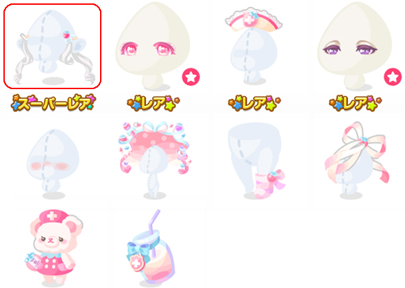 ★いちごミルクエクステ ☆うるうるいちごミルクアイ(顔パーツ) ☆いちごのナースキャップ ☆ぐったり元気がないアイ(顔パーツ) ふらふらお熱チーク おくすりリボンフレーム いたいのとんでけギプス いちごグラデの包帯リボン お供のくまちゃんナース 元気になるいちごミルク