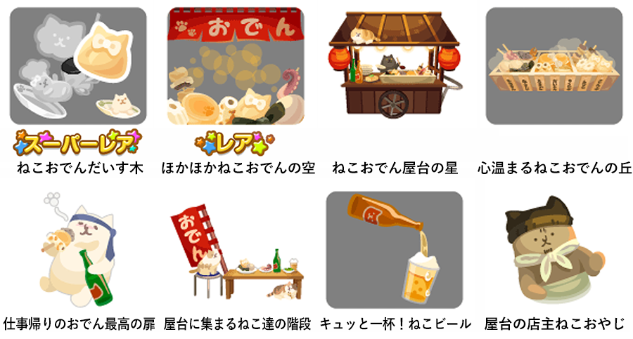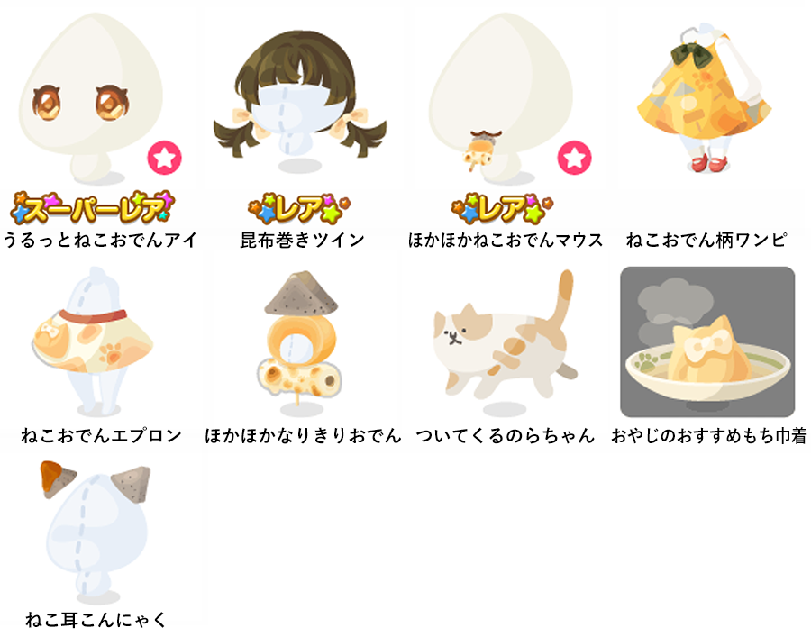 ★うるっとねこおでんアイ(顔パーツ) ☆昆布巻きツイン ☆ほかほかねこおでんマウス(顔パーツ) ねこおでん柄ワンピ ねこおでんエプロン ほかほかなりきりおでん(アクション付きfアイテム) ついてくるのらちゃん おやじのおすすめもち巾着 ねこ耳こんにゃく