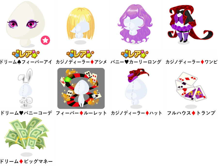 ☆ドリーム♠️フィーバーアイ(顔パーツ) ☆カジノディーラー♦️アシメ ☆バニー♥カーリーロング カジノディーラー♦️ワンピ ドリーム♥バニーコーデ フィーバー♦️ルーレット カジノディーラー♦️ハット フルハウス♦️トランプ ドリーム♦️ビッグマネー