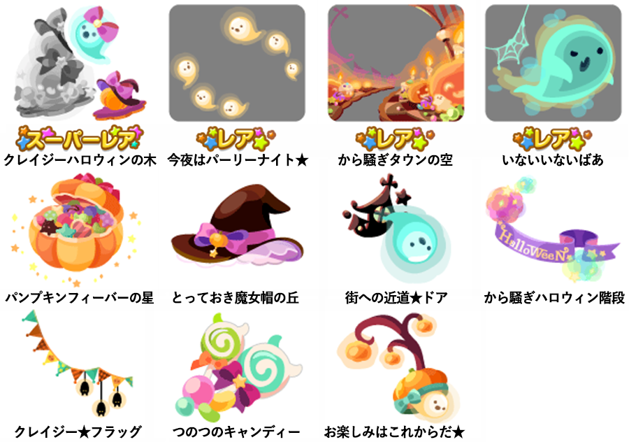 ★クレイジーハロウィンの木 No.1054 クレイジー★おばけまん ハロウィン★おばけの実 ☆今夜はパーリーナイト★ ☆から騒ぎタウンの空 ☆いないいないばあ パンプキンフィーバーの星 とっておき魔女帽の丘 街への近道★ドア から騒ぎハロウィン階段 クレイジー★フラッグ つのつのキャンディー お楽しみはこれからだ★