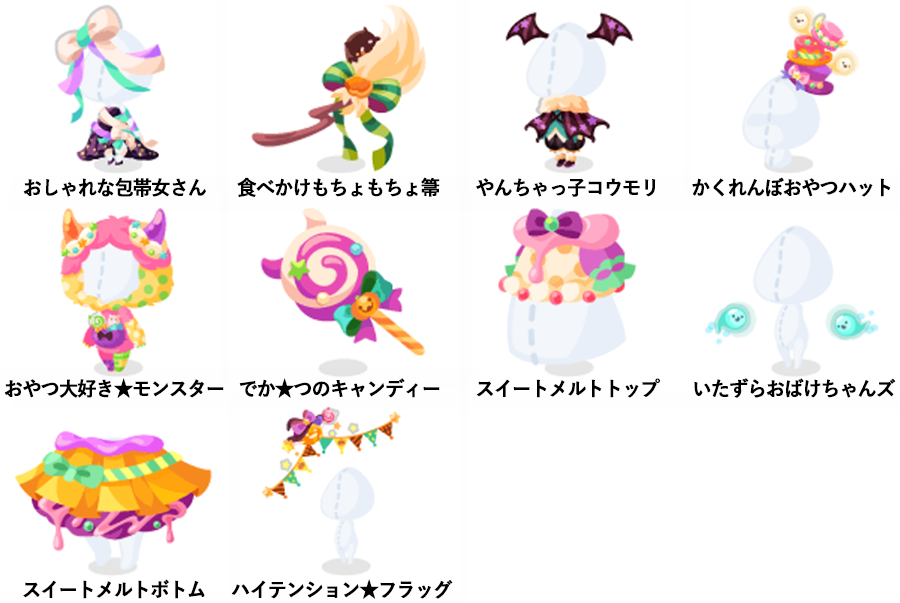 ★いたずら★クレイジーアイ(顔パーツ) ★クレイジー★くるんツイン ☆ハイテンション魔女ワンピ ☆ニヤリ★クレイジーマウス(顔パーツ) ☆いたずらモンスターヘア ☆いたずら魔女の帽子 ☆ニヤリ★クレイジーアイ(顔パーツ) ☆ハロウィン★デコメイク おしゃれな包帯女さん 食べかけもちょもちょ箒 やんちゃっ子コウモリ かくれんぼおやつハット おやつ大好き★モンスター でか★つのキャンディー スイートメルトトップ いたずらおばけちゃんズ スイートメルトボトム ハイテンション★フラッグ