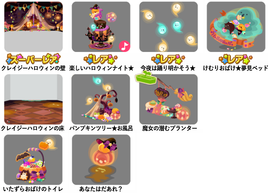 ★クレイジーハロウィンの壁 ☆楽しいハロウィンナイト★(ネイロアイテム) ☆今夜は踊り明かそう★ ☆けむりおばけ★夢見ベッド クレイジーハロウィンの床 パンプキンツリー★お風呂 魔女の潜むプランター いたずらおばけのトイレ あなたはだあれ?