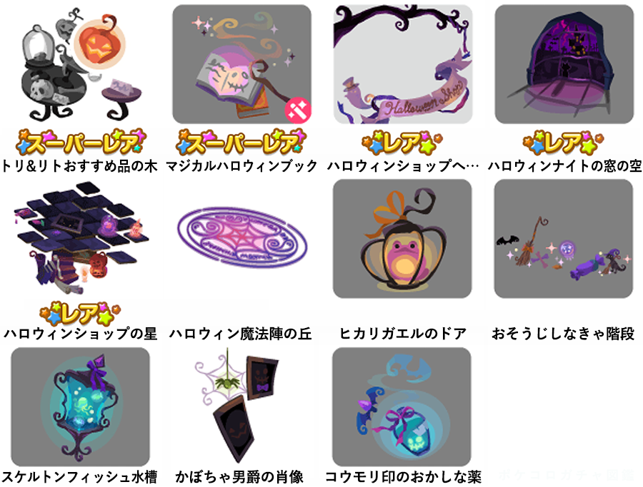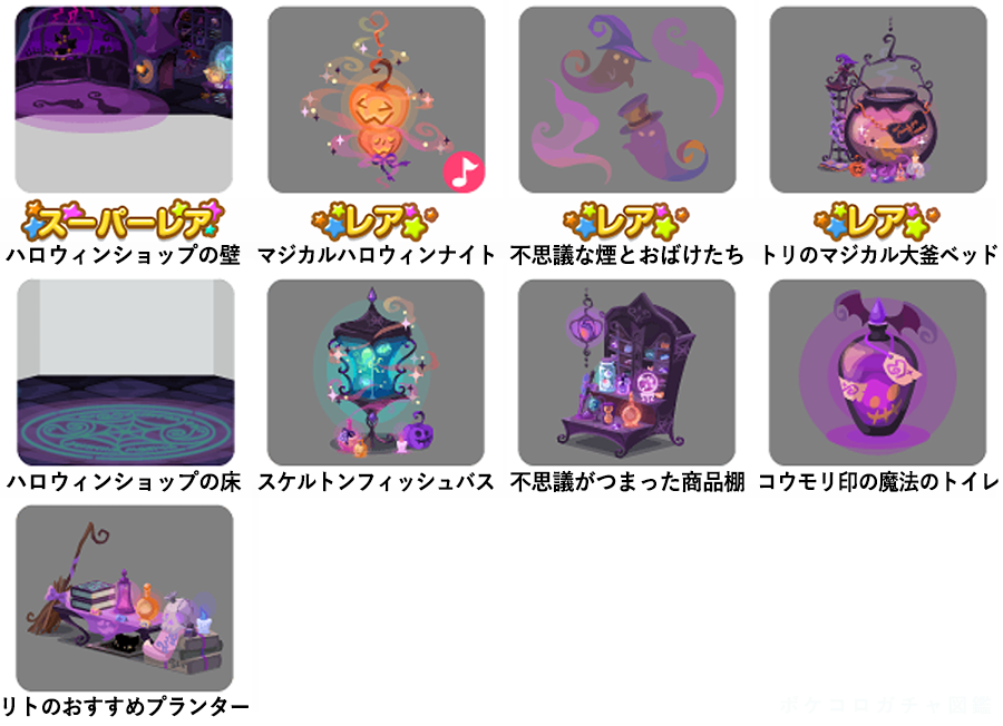 ★ハロウィンショップの壁 ☆マジカルハロウィンナイト(ネイロアイテム) ☆不思議な煙とおばけたち ☆トリのマジカル大釜ベッド ハロウィンショップの床 スケルトンフィッシュバス 不思議がつまった商品棚 コウモリ印の魔法のトイレ リトのおすすめプランター