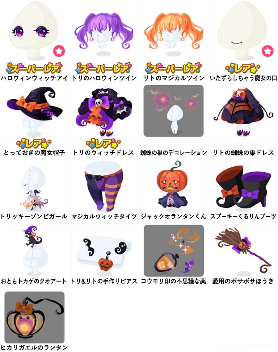 ★ハロウィンウィッチアイ(顔パーツ) ★トリのハロウィンツイン ★リトのマジカルツイン ☆いたずらしちゃう魔女の口(顔パーツ) ☆とっておきの魔女帽子 ☆トリのウィッチドレス 蜘蛛の巣のデコレーション リトの蜘蛛の巣ドレス トリッキーゾンビガール マジカルウィッチタイツ ジャックオランタンくん(アクション付きfアイテム) スプーキーくるりんブーツ おともトカゲのクオアート トリ&リトの手作りピアス コウモリ印の不思議な薬 愛用のボサボサほうき ヒカリガエルのランタン