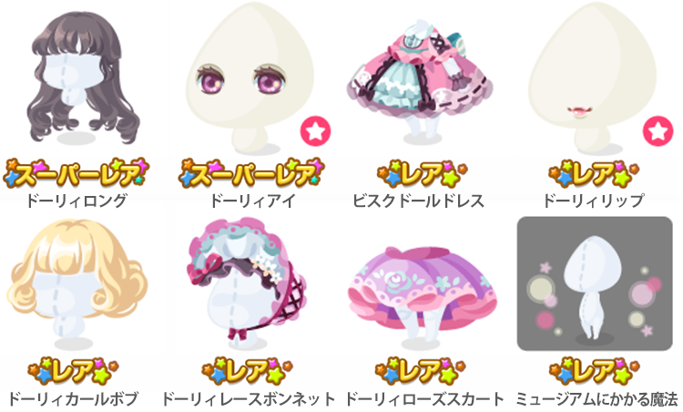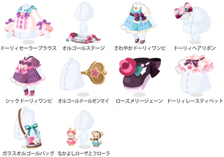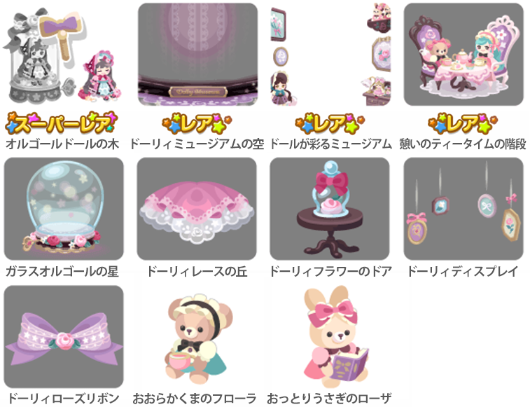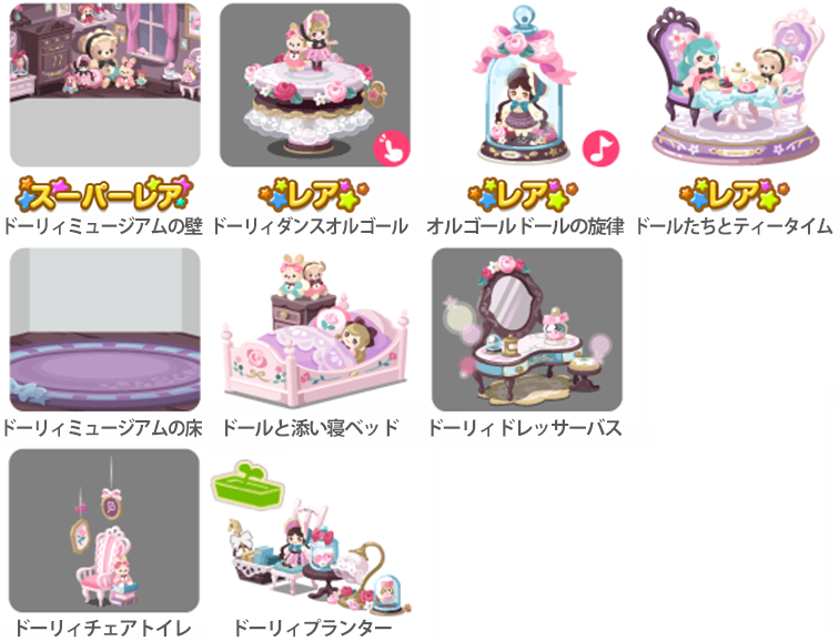 ★ドーリィミュージアムの壁 ☆ドーリィダンスオルゴール(アクションアイテム) ☆オルゴールドールの旋律(ネイロアイテム) ☆ドールたちとティータイム ドーリィミュージアムの床 ドールと添い寝ベッド ドーリィドレッサーバス ドーリィチェアトイレ ドーリィプランター