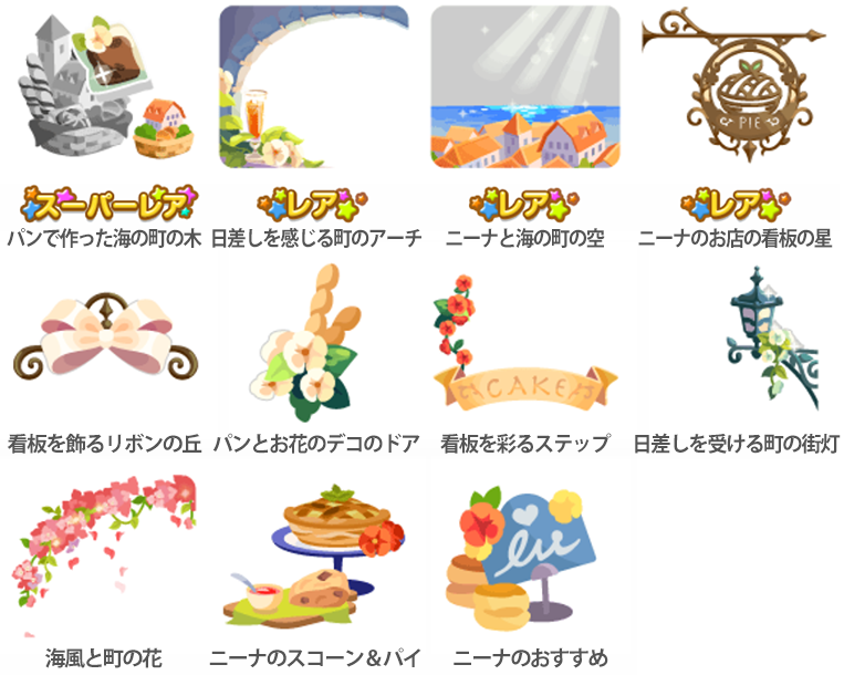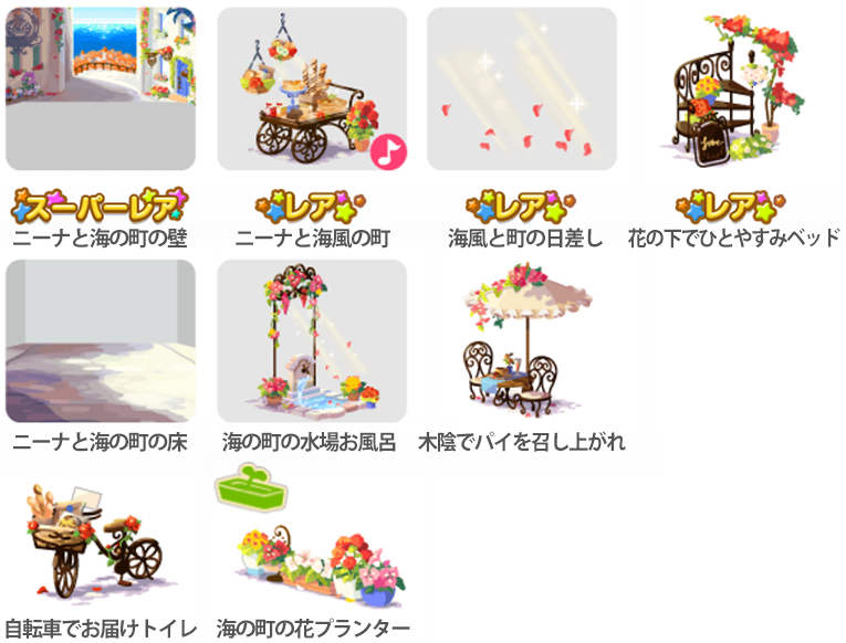 ★ニーナと海の町の壁 ☆ニーナと海風の町(ネイロアイテム) ☆海風と町の日差し ☆花の下でひとやすみベッド ニーナと海の町の床 海の町の水場お風呂 木陰でパイを召し上がれ 自転車でお届けトイレ 海の町の花プランター