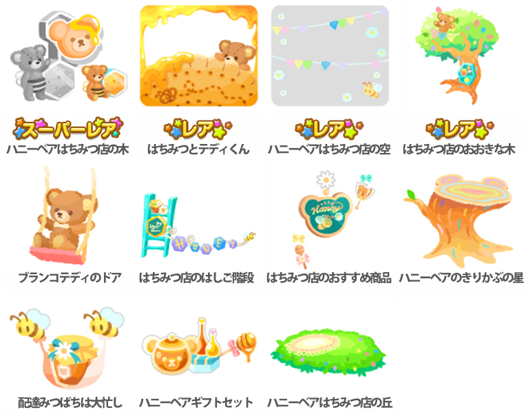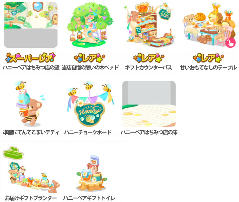 ★ハニーベアはちみつ店の壁 ☆当店自慢の憩いの木ベッド ☆ギフトカウンターバス ☆甘いおもてなしのテーブル(アクションアイテム) 準備にてんてこまいテディ ハニーチョークボード ハニーベアはちみつ店の床 お届けギフトプランター ハニーベアギフトトイレ