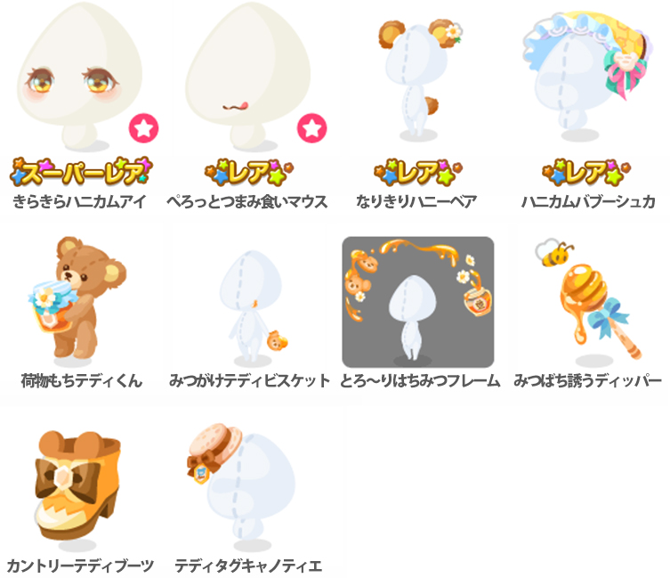 ★きらきらハニカムアイ(顔パーツ) ☆ぺろっとつまみ食いマウス(顔パーツ) ☆なりきりハニーベア ☆ハニカムバブーシュカ 荷物もちテディくん みつがけテディビスケット とろ〜りはちみつフレーム みつばち誘うディッパー カントリーテディブーツ テディタグキャノティエ