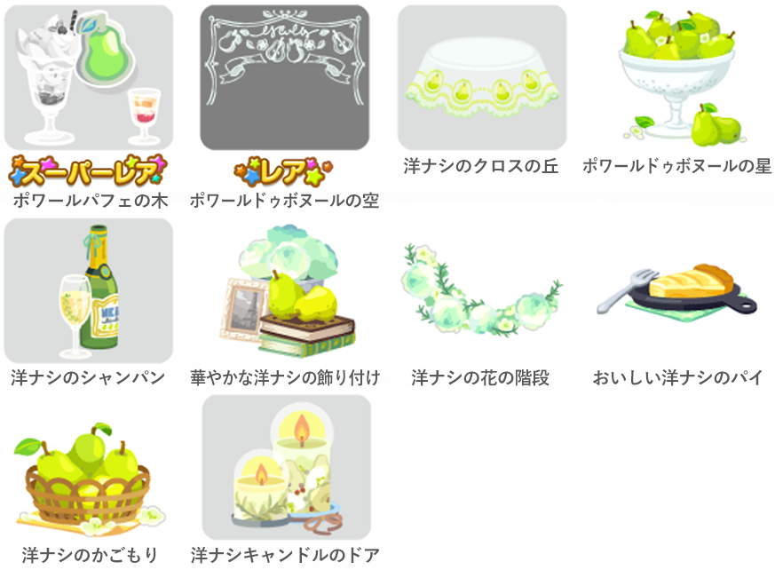 ★ポワールパフェの木 No.1044 さわやか洋ナシまん 洋ナシピックの実 ☆ポワールドゥボヌールの空 洋ナシのクロスの丘 ポワールドゥボヌールの星 洋ナシのシャンパン 華やかな洋ナシの飾り付け 洋ナシの花の階段 おいしい洋ナシのパイ 洋ナシのかごもり 洋ナシキャンドルのドア
