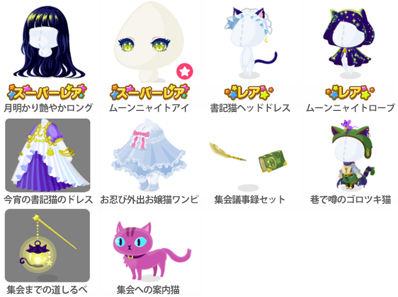 ★月明かり艶やかロング ★ムーンニャイトアイ(顔パーツ) ☆書記猫ヘッドドレス ☆ムーンニャイトローブ 今宵の書記猫のドレス お忍び外出お嬢猫ワンピ 集会議事録セット 巷で噂のゴロツキ猫 集会までの道しるべ 集会への案内猫