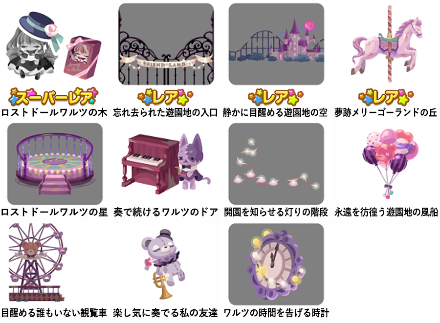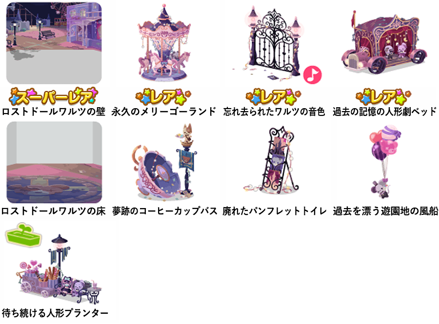 ★ロストドールワルツの壁 ☆永久のメリーゴーランド ☆忘れ去られたワルツの音色(ネイロアイテム) ☆過去の記憶の人形劇ベッド ロストドールワルツの床 夢跡のコーヒーカップバス 廃れたパンフレットトイレ 過去を漂う遊園地の風船 待ち続ける人形プランター
