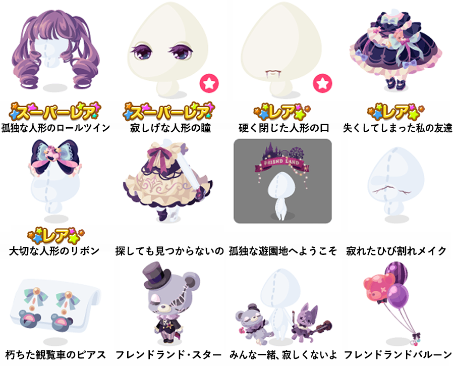 ★孤独な人形のロールツイン ★寂しげな人形の瞳(顔パーツ) ☆硬く閉じた人形の口(顔パーツ) ☆失くしてしまった私の友達 ☆大切な人形のリボン 探しても見つからないの 孤独な遊園地へようこそ 寂れたひび割れメイク 朽ちた観覧車のピアス フレンドランド・スター みんな一緒、寂しくないよ フレンドランドバルーン