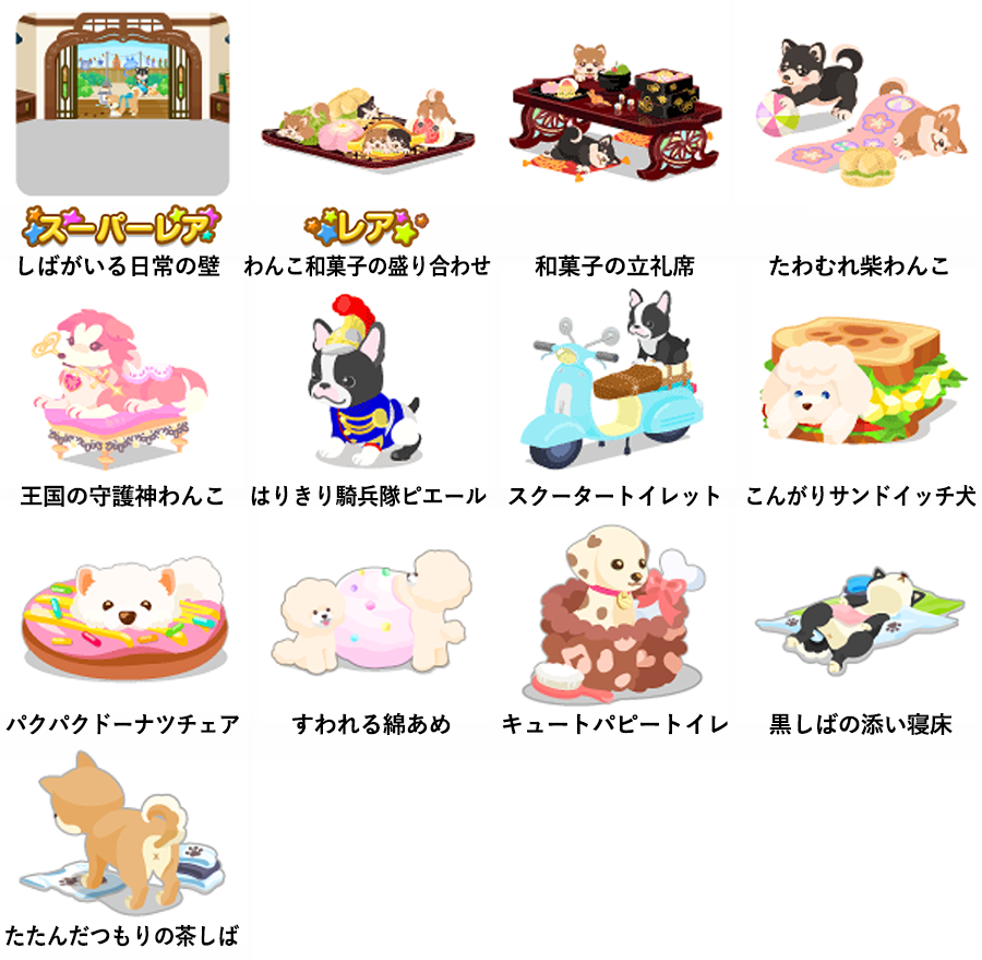 ★しばがいる日常の壁 ☆わんこ和菓子の盛り合わせ 和菓子の立礼席 たわむれ柴わんこ 王国の守護神わんこ はりきり騎兵隊ピエール スクータートイレット こんがりサンドイッチ犬 パクパクドーナツチェア すわれる綿あめ キュートパピートイレ 黒しばの添い寝床 たたんだつもりの茶しば