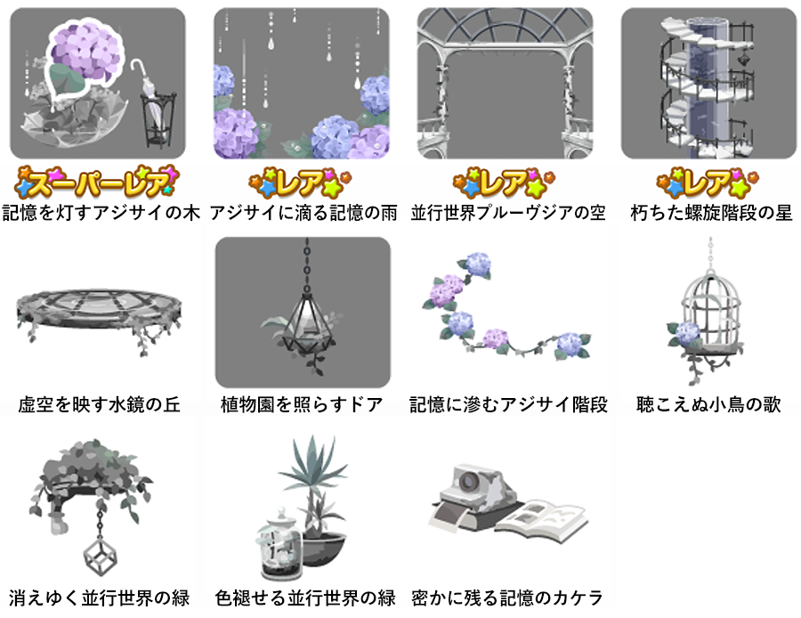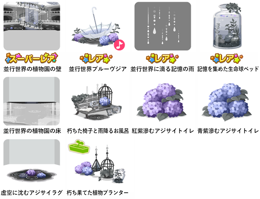 ★並行世界の植物園の壁 ☆並行世界プルーヴジア(ネイロアイテム) ☆並行世界に滴る記憶の雨 ☆記憶を集めた生命球ベッド 並行世界の植物園の床 朽ちた椅子と雨降るお風呂 紅紫滲むアジサイトイレ 青紫滲むアジサイトイレ 虚空に沈むアジサイラグ 朽ち果てた植物プランター