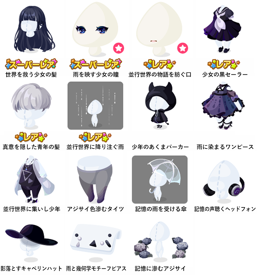 ★世界を救う少女の髪 ★雨を映す少女の瞳(顔パーツ) ☆並行世界の物語を紡ぐ口(顔パーツ) ☆少女の黒セーラー ☆真意を隠した青年の髪 ☆並行世界に降り注ぐ雨 少年のあくまパーカー 雨に染まるワンピース 並行世界に集いし少年 アジサイ色滲むタイツ 記憶の雨を受ける傘 記憶の声聴くヘッドフォン 影落とすキャペリンハット 雨と幾何学モチーフピアス 記憶に滲むアジサイ
