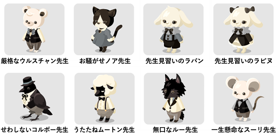 厳格なウルスチャン先生 お騒がせノア先生 先生見習いのラパン 先生見習いのラピヌ せわしないコルボー先生 うたたねムートン先生 無口なルー先生 一生懸命なスーリ先生