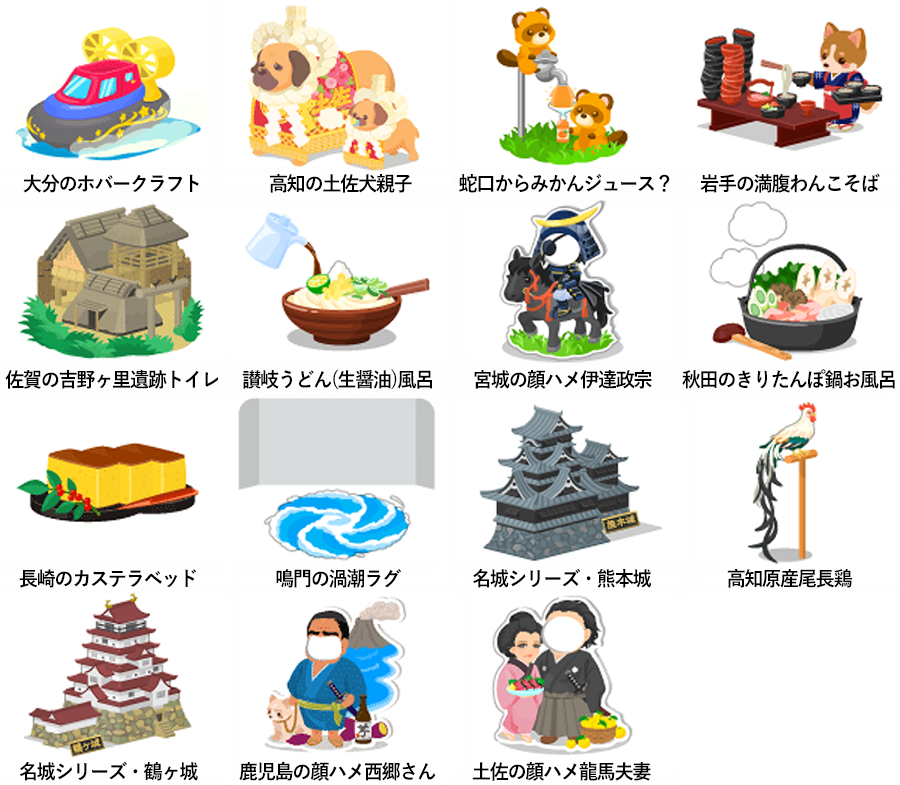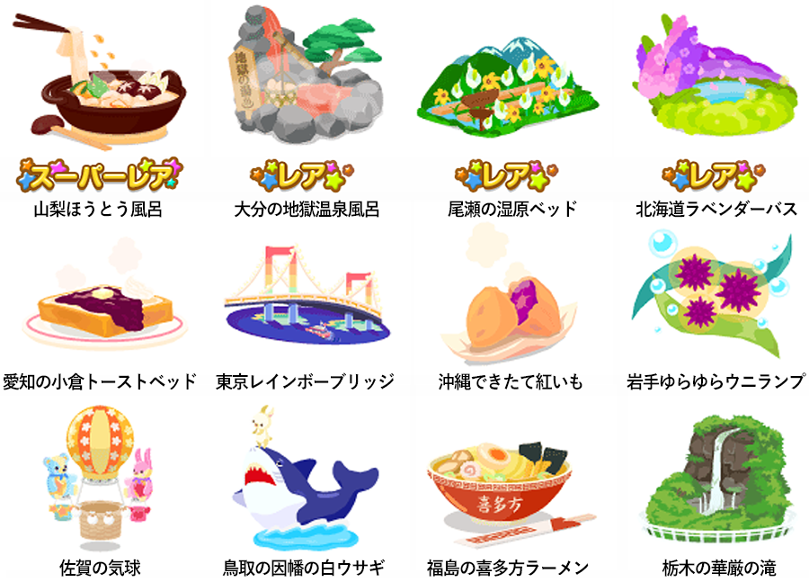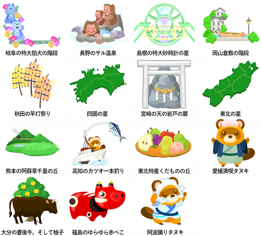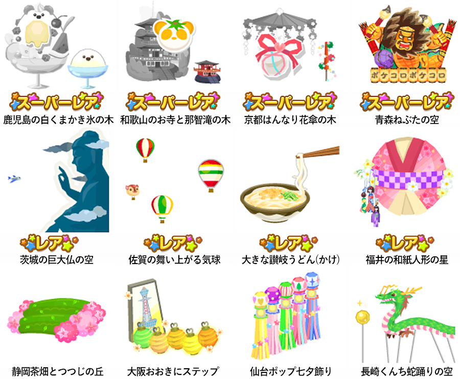 ★鹿児島の白くまかき氷の木 No.323 しっとりかるかん 鹿児島じまんの山芋とろろ ★和歌山のお寺と那智滝の木 No.366 パンダみかんかき氷 パンダみかん ★京都はんなり花傘の木 No.298 はんなりころりんお吸物 はんなり手まり麩 ★青森ねぶたの空 ☆茨城の巨大仏の空 ☆佐賀の舞い上がる気球 ☆大きな讃岐うどん(かけ) ☆福井の和紙人形の星 静岡茶畑とつつじの丘 大阪おおきにステップ 仙台ポップ七夕飾り 長崎くんち蛇踊りの空 岐阜の特大狛犬の階段 長野のサル温泉 島根の特大砂時計の星 岡山倉敷の階段 秋田の竿灯祭り 四国の星 宮崎の天の岩戸の扉 東北の星 熊本の阿蘇草千里の丘 高知のカツオ一本釣り 東北特産くだものの丘 愛媛満喫タヌキ 大分の豊後牛、そして柚子 福島のゆらゆら赤べこ 阿波踊りタヌキ
