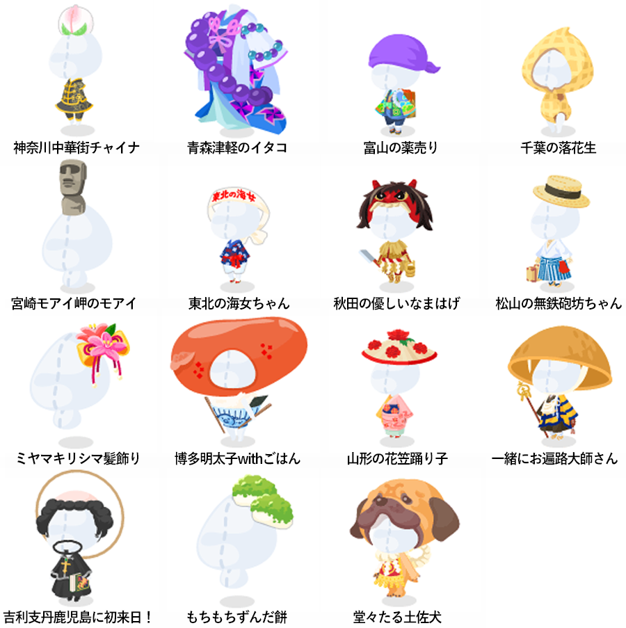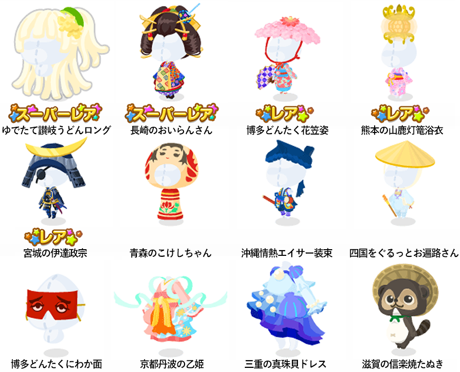 ★ゆでたて讃岐うどんロング ★長崎のおいらんさん ☆博多どんたく花笠姿 ☆熊本の山鹿灯篭浴衣 ☆宮城の伊達政宗 青森のこけしちゃん 沖縄情熱エイサー装束 四国をぐるっとお遍路さん 博多どんたくにわか面 京都丹波の乙姫 三重の真珠貝ドレス 滋賀の信楽焼たぬき 神奈川中華街チャイナ 青森津軽のイタコ 富山の薬売り 千葉の落花生 宮崎モアイ岬のモアイ 東北の海女ちゃん 秋田の優しいなまはげ 松山の無鉄砲坊ちゃん ミヤマキリシマ髪飾り 博多明太子withごはん 山形の花笠踊り子 一緒にお遍路大師さん 吉利支丹鹿児島に初来日! もちもちずんだ餅 堂々たる土佐犬