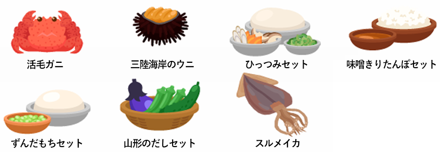 活毛ガニ No.670 北海道毛ガニボイル 三陸海岸のウニ No.671 青森いちご煮 ひっつみセット No.672 岩手ひっつみ 味噌きりたんぽセット No.674 秋田味噌きりたんぽ ずんだもちセット No.673 宮城ずんだもち 山形のだしセット No.675 山形だし丼 スルメイカ No.676 福島いかにんじん