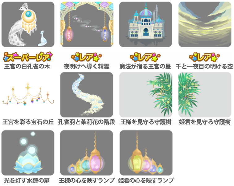 ★王宮の白孔雀の木 No.1000 千と一夜が明ける小籠包 姫君に贈る宝石の実 ☆夜明けへ導く精霊 ☆魔法が宿る王宮の星 ☆千と一夜目の明ける空 王宮を彩る宝石の丘 孔雀羽と茉莉花の階段 王様を見守る守護樹 姫君を見守る守護樹 光を灯す水蓮の扉 王様の心を映すランプ 姫君の心を映すランプ
